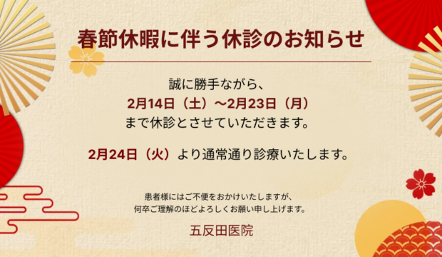 2月14日(土)~2月23日(月)まで休診とさせていただきます。